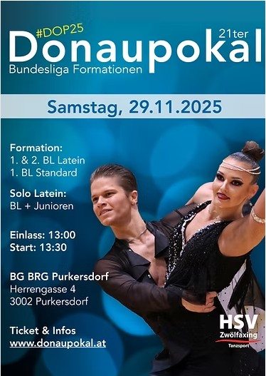 Einmal mehr markiert der Donaupokal den Beginn der Bundesligasaison in Österreich. Mit dabei waren Teams aus den Ligen Solo Latein Juniors, Solo Latein Adults, 1. Bundesliga Standard, 1. Bundesliga Latein und 2. Bundesliga Latein. Der Großteil der 23 teilnehmenden Teams stammte aus Österreich, aber wir durften uns auch über internationale Gäste aus Deutschland und Serbien freuen. Noch internationaler präsentierte sich das Wertungsgericht aus Österreich, Ungarn, Deutschland, Tschechien, Lettland und den Niederlanden.